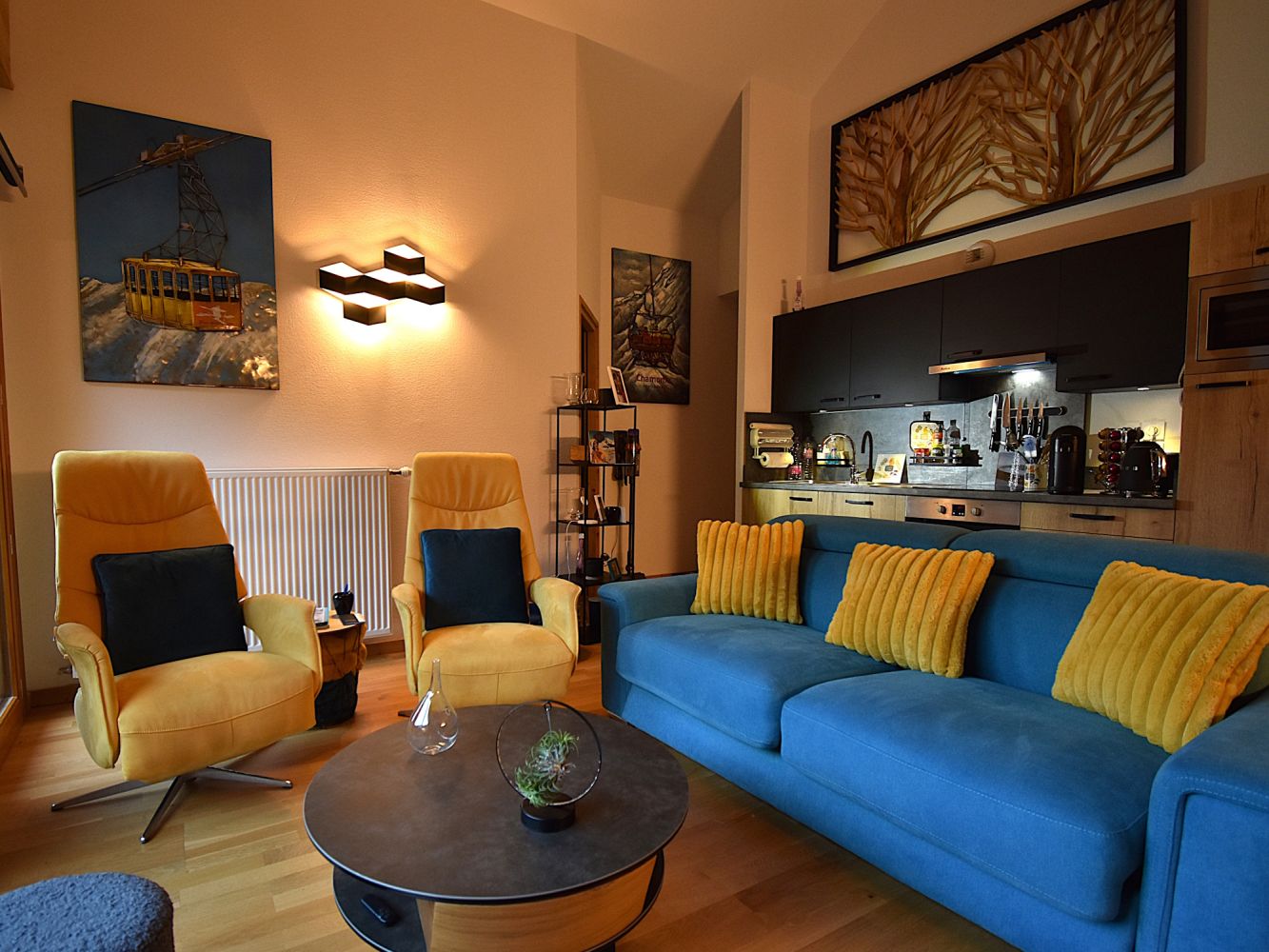 Gemütliches Wohnzimmer mit Doppelschlafcouch, Esstisch und TV. Küche mit Herd, Backofen/Mikrowelle, Kühlschrank, Kaffeemaschine, Wasserkocher, Toaster und Spülmaschine.