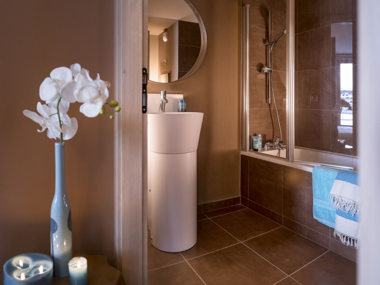 Zwei Schlafzimmer, eines mit einem Doppelbett. Das zweite Schlafzimmer hat zwei Einzelbetten, aber kein Fenster. Zwei Bäder, jeweils mit Badewanne oder Dusche und Toilette.
