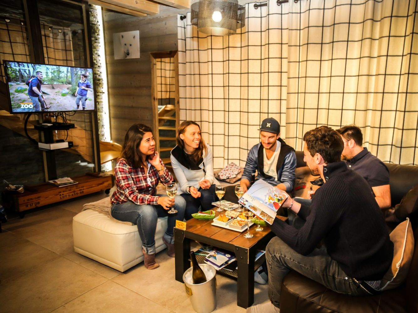 Wohnzimmer mit Sitzecke, Fernseher und DVD-Player. Voll ausgestattete Küche mit Essecke, Kühlschrank, Herd, Kaffeemaschine, Mikrowelle, Backofen und Geschirrspüler. Außerdem verfügt das Chalet über einen beheizten Skiraum, Balkon und Terrasse, Waschküche mit Waschmaschine und Trockner, Hammam und Whirlpool.