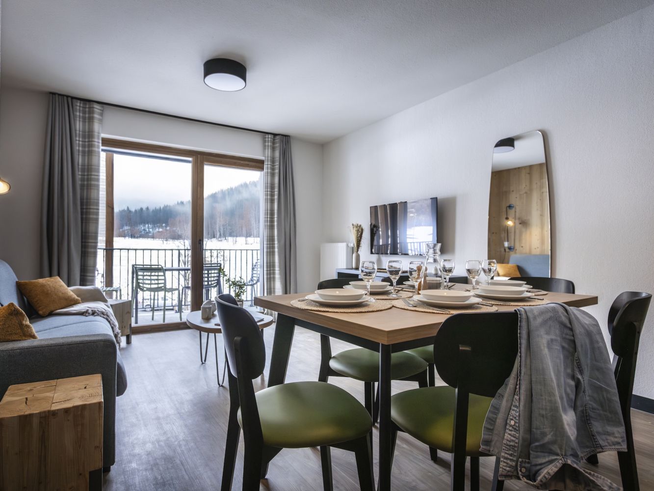 Gemütliches Wohnzimmer mit Doppelschlafcouch, TV und Esstisch. Küche mit Kochplatten, Wasserkocher, Kaffeemaschine, Kühlschrank und Geschirrspüler, unter anderem. Dieser Typ hat auch einen Balkon.