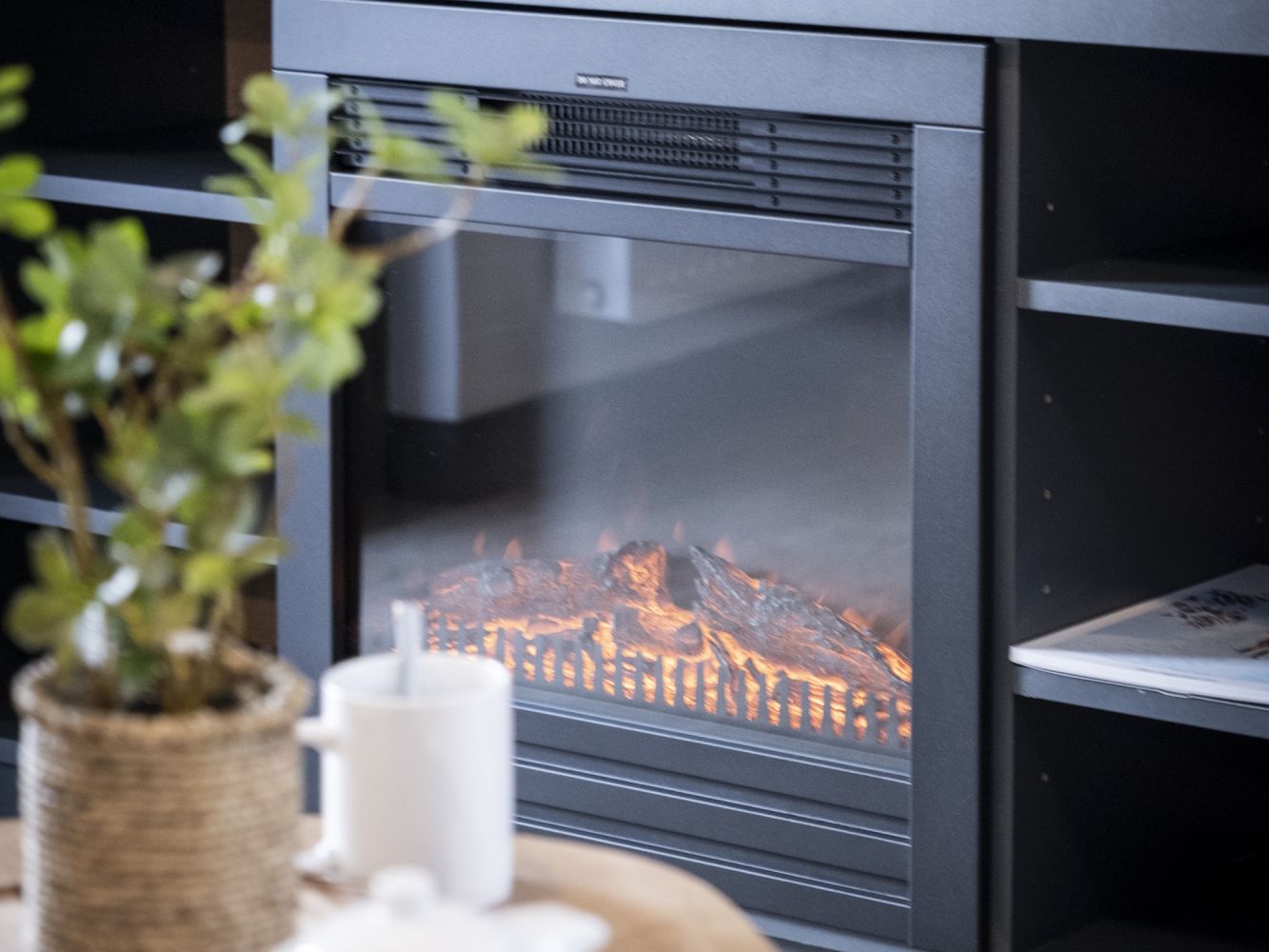 Gemütliches Wohnzimmer mit einer Doppelschlafcouch, TV, gemütlichem Kamin und Esstisch. Küche mit u.a. Kochplatten, Wasserkocher, Kaffeemaschine, Kühlschrank und Geschirrspüler. Dieser Typ hat auch einen Balkon oder eine Terrasse.