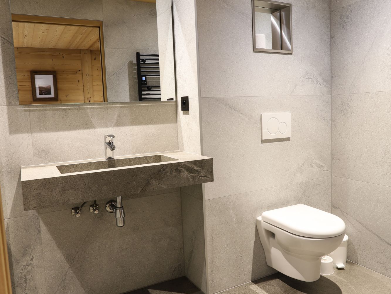 Im Erdgeschoss des Chalets befindet sich der private Wellnessbereich, in dem die Gäste des Appartements Les Seracs Zugang zu ihrem eigenen Whirlpool und ihrer eigenen Sauna haben. Außerdem gibt es hier ein Badezimmer mit Dusche und Toilette. Von diesem Raum aus haben Sie direkten Zugang zum Garten.