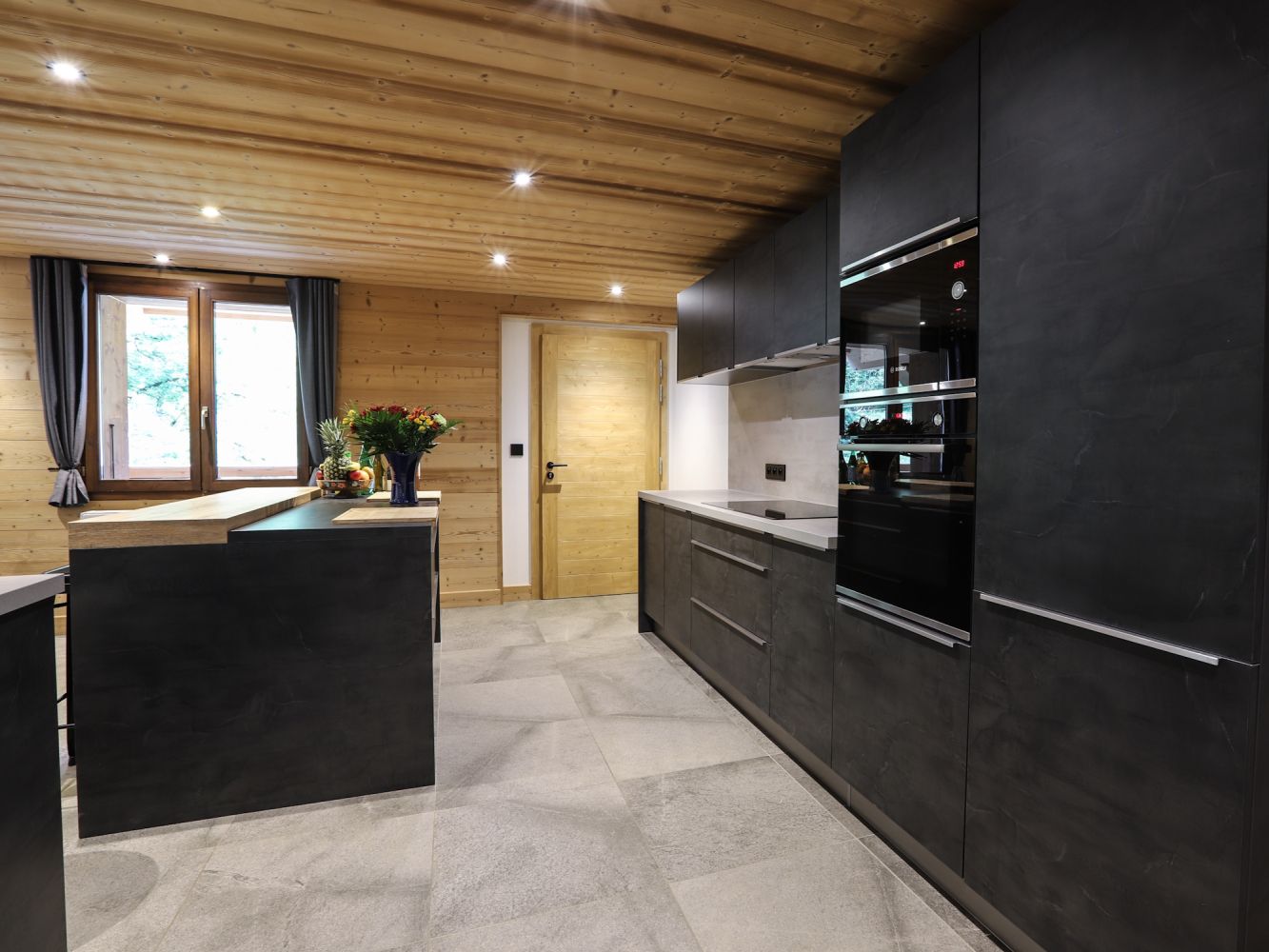 Wohnzimmer mit gemütlicher Sitzecke mit Kamin, Fernseher und Radio. Die voll ausgestattete offene Küche verfügt über ein Induktionskochfeld, Kühlschrank, Gefrierschrank, Backofen, Mikrowelle, zwei Filterkaffeemaschinen, eine Dolce Gusto-Kaffeemaschine, zwei Wasserkocher, Raclette-Set, Fondue-Set, Toaster und eine Spülmaschine. Außerdem verfügt diese Chalet-Wohnung über eine Waschmaschine und einen Trockner sowie Wi-Fi.