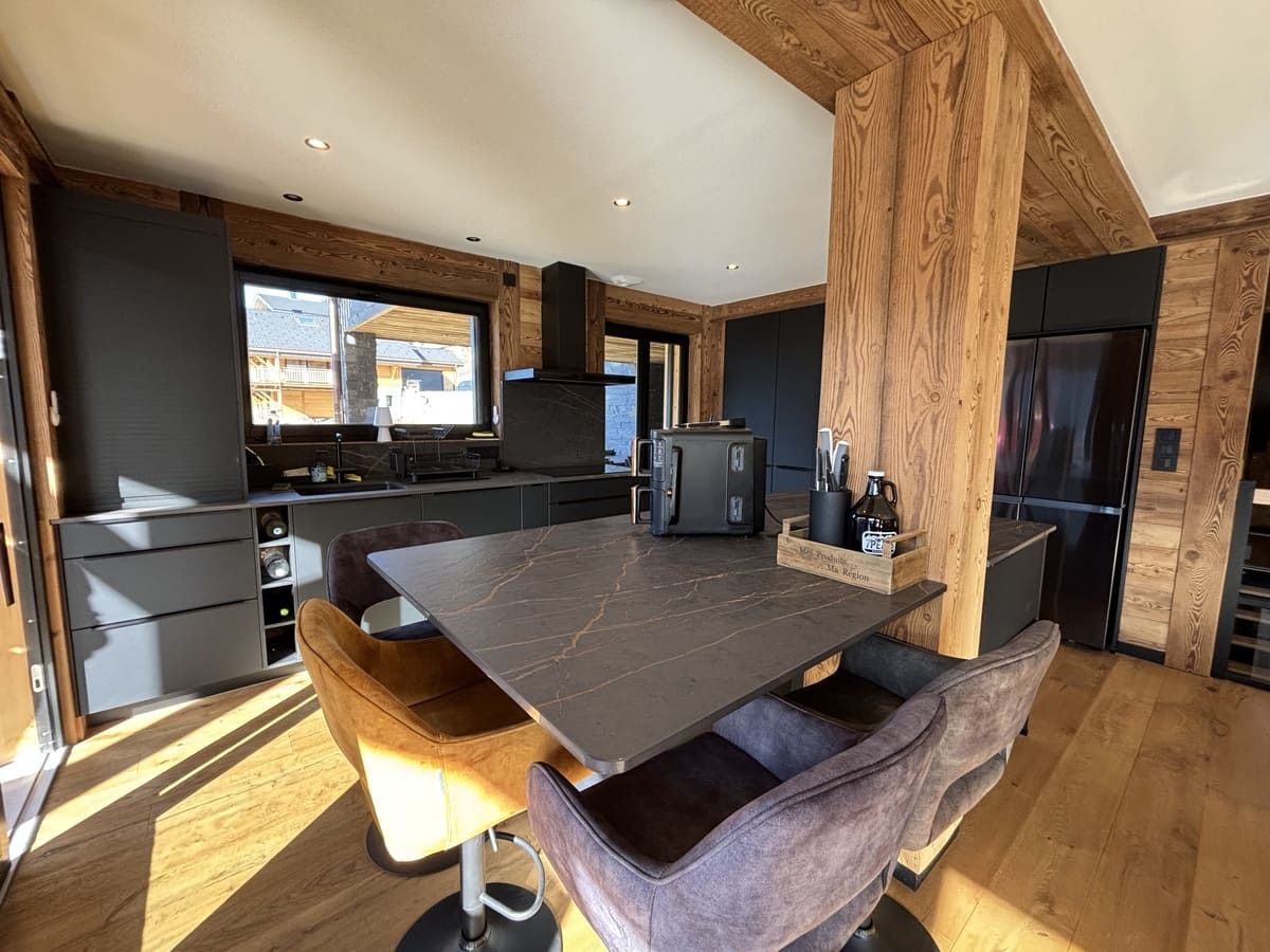 Gemütliches, modernes Wohnzimmer mit komfortabler Sitzecke, Fernseher und Kaminofen. Küche mit Esstisch, Induktionskochfeld, Backofen, Mikrowelle, Kaffeemaschine, Wasserkocher, Kühlschrank mit Gefrierfach und Geschirrspüler. Durch das Wohnzimmer haben Sie Zugang zum geräumigen Balkon mit Whirlpool, von dem aus Sie einen schönen Blick auf die umliegenden Berge haben. Außerdem verfügt dieses Chalet über eine Sauna, eine Waschmaschine und einen Trockner.