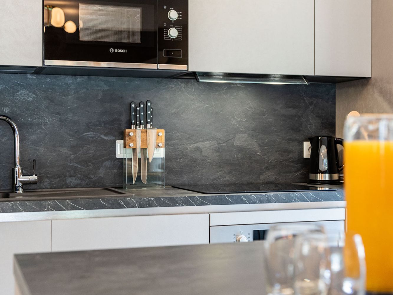 Gemütliches Wohnzimmer mit einer schönen Sitzecke und Fernseher. Offene Küche mit u.a. einem Esstisch, Kochplatten, Backofen, Wasserkocher und Geschirrspüler. Das Wohnzimmer öffnet sich auf einen Balkon mit schöner Aussicht. Im zweiten Stock gibt es eine zusätzliche Sitzecke mit Fernseher.