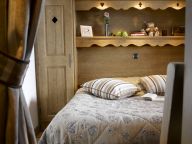 Ein Schlafzimmer mit Doppelbett und eine Schlafkabine mit Etagenbett. Ein Badezimmer mit Badewanne. Toilette.