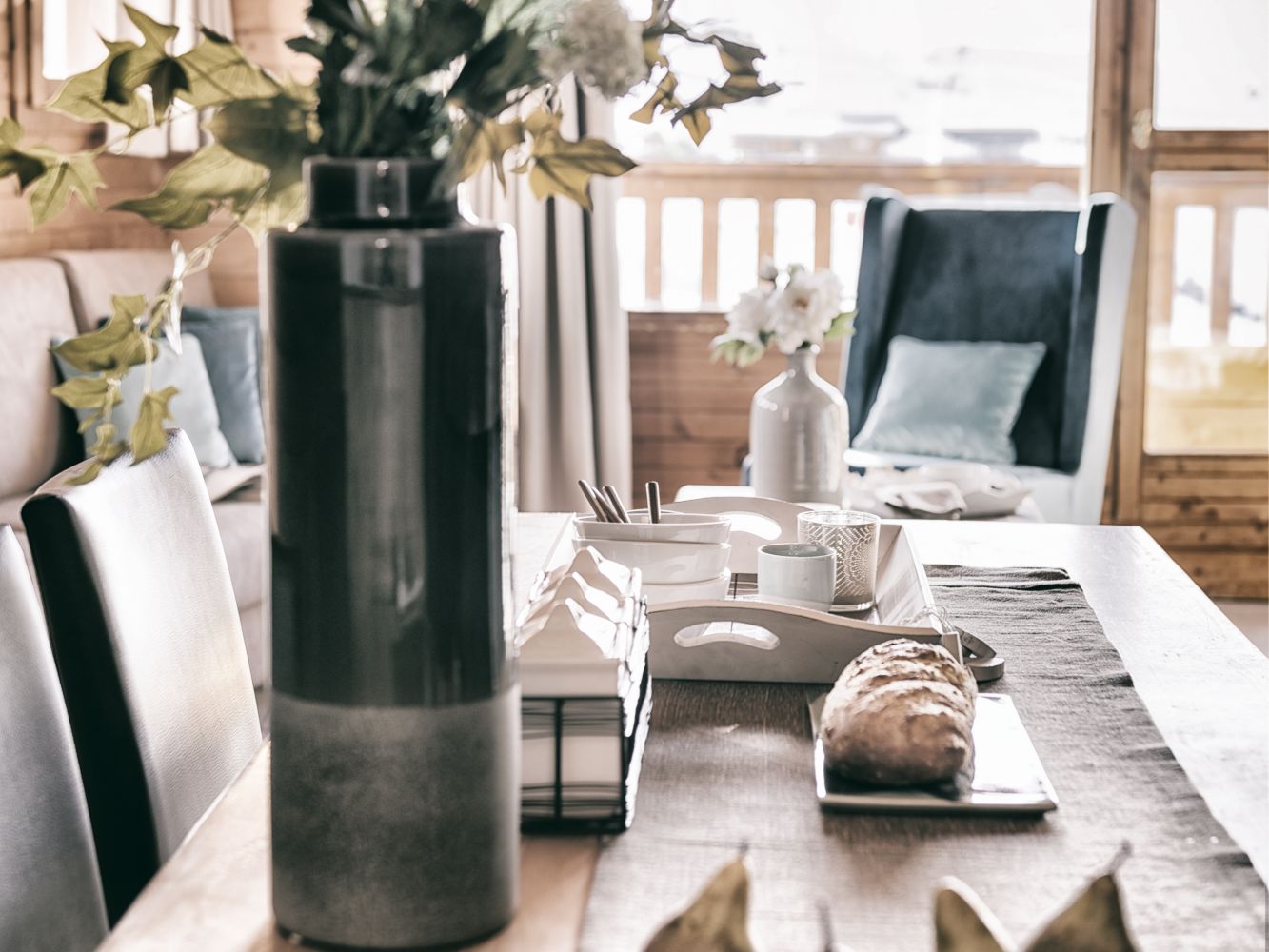 Attraktiv eingerichtetes Wohnzimmer mit gemütlicher Sitzecke, Kamin, Flachbildfernseher und Essecke. Küche mit Kaffeemaschine (Dolce Gusto), Backofen, Mikrowelle, Kühlschrank, vier Cerankochfeldern und Geschirrspüler. Außerdem gibt es einen Skiabstellraum und einen Balkon.