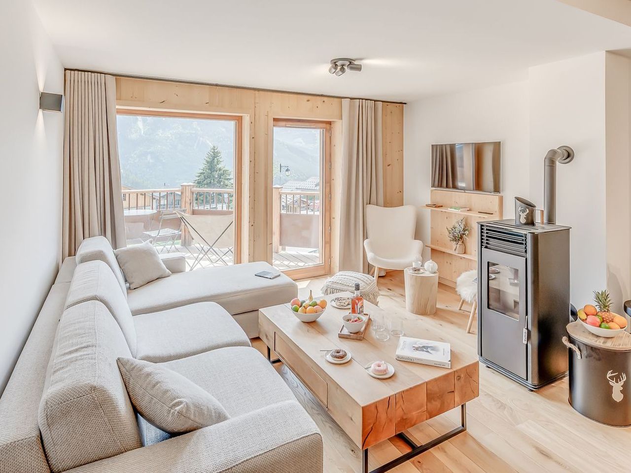 Gemütliches Wohnzimmer mit einem Doppelschlafsofa, Fernseher und einem Pelletofen. Durch das Wohnzimmer hat man Zugang zum Balkon, vom Balkon aus hat man eine schöne Aussicht. Küche mit u.a. einem Esstisch, Induktionskochfeld, Backofen/Mikrowelle, Wasserkocher, Kaffeemaschine und Geschirrspüler.