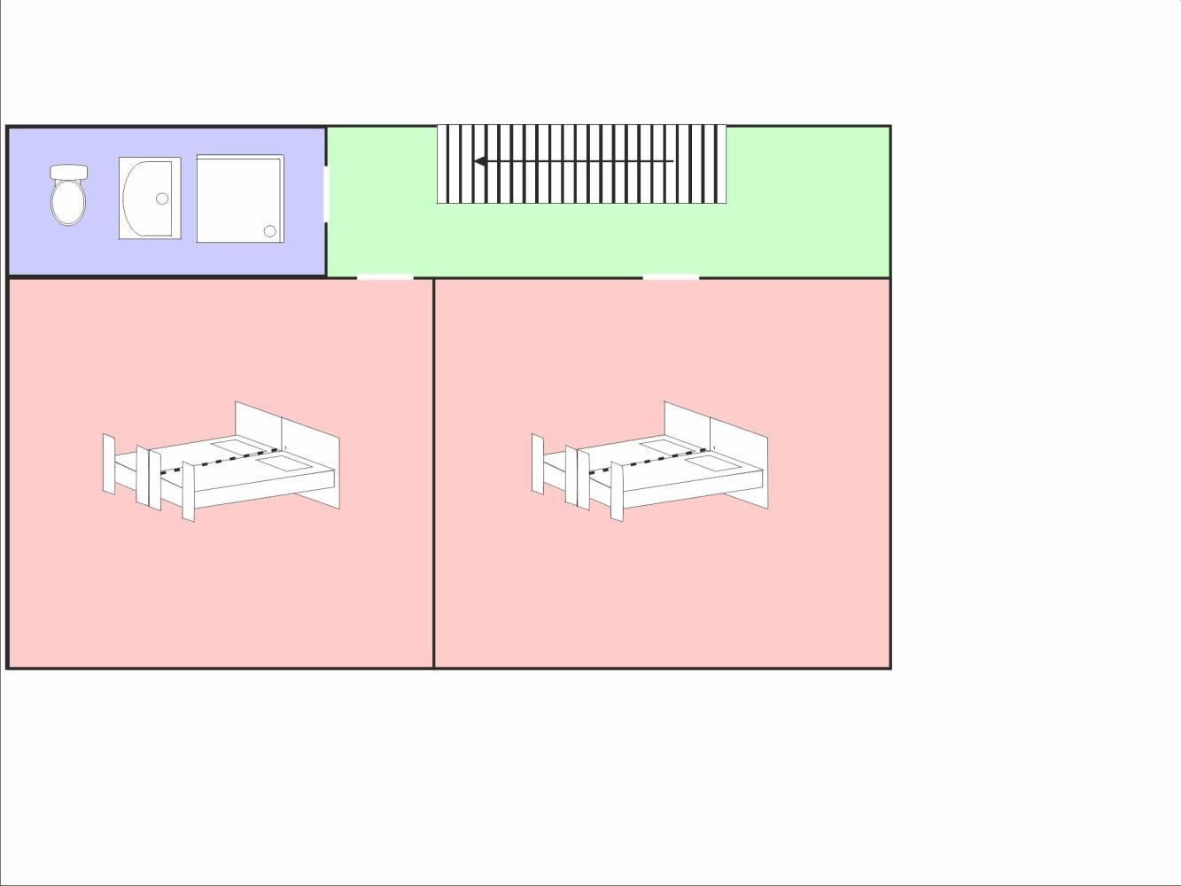 Im ersten Stock befinden sich zwei Schlafzimmer mit je zwei Einzelbetten (können zu einem Doppelbett zusammengeschoben werden). Badezimmer mit Dusche und Toilette.