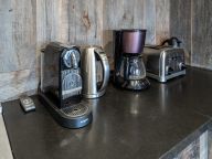 Geräumiges, gemütliches Wohnzimmer mit bequemer Sitzecke mit Kamin und Esstisch. Voll ausgestattete Küche mit Elektroherd, Kühl- und Gefrierschrank, Geschirrspüler, Kaffeemaschine, Wasserkocher und Backofen. Vom Wohnzimmer aus hat man Zugang zu einem großen, erweiterten Balkon mit schönem Blick auf das gegenüberliegende Skigebiet von La Plagne.
