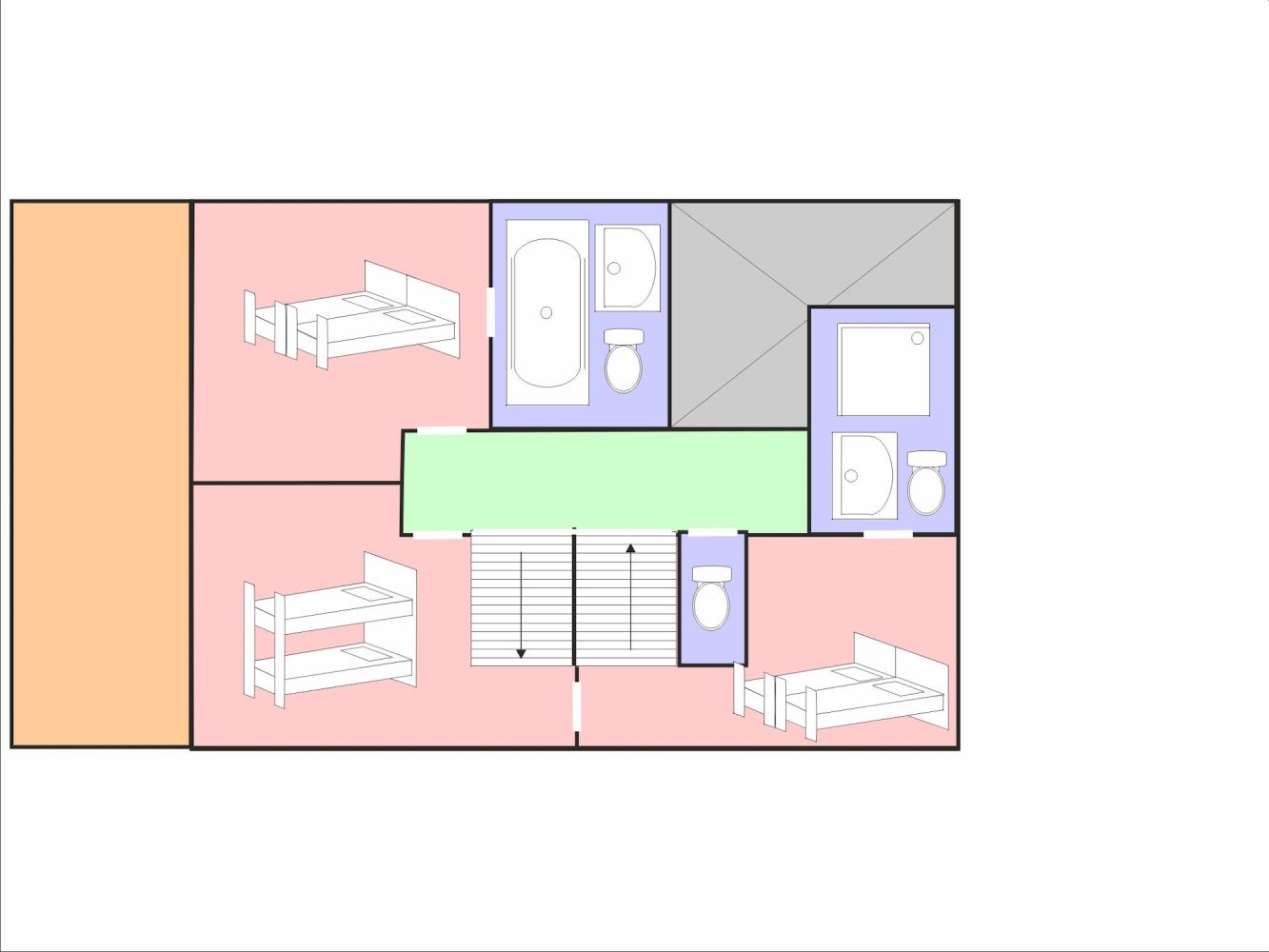 Drei Schlafzimmer, jedes mit einem Doppelbett. Ein Schlafzimmer mit zwei Einzelbetten. Ein 4-Bett-Zimmer mit einem Doppelbett und Etagenbetten. Ein Vierbettzimmer mit einem Doppelbett und zwei Einzelbetten. Zwei Bäder, jeweils mit Massagedusche. Ein Badezimmer mit Whirlpool-Badewanne und Toilette. Ein Badezimmer mit einer Badewanne. Ein Badezimmer mit Dusche und Toilette. Drei separate Toiletten.