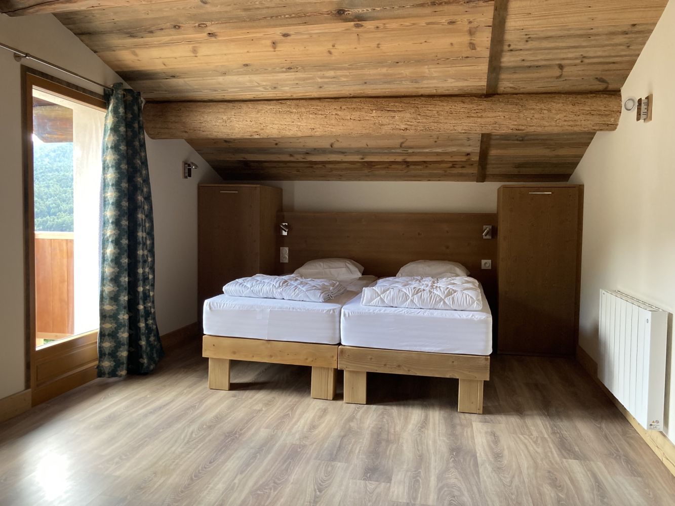 Im Dachgeschoss befinden sich zwei Schlafzimmer, eines mit zwei Einzelbetten. Das zweite Zimmer hat zwei Einzelbetten, eine Sitzecke, einen Fernseher und Zugang zum Balkon. Badezimmer im Hochparterre mit Dusche und Toilette.
