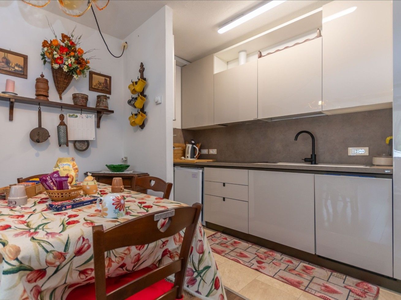 Wohnzimmer mit Sitzecke mit Doppelschlafcouch, TV und Essecke. Küche mit 4-Flammen-Elektroherd, Kaffeemaschine, Wasserkocher, Mikrowelle und Kühlschrank, unter anderem. Es gibt einen Balkon.