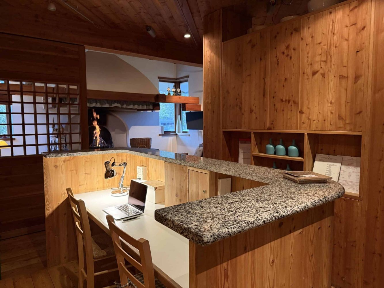 Wohnzimmer mit Sitzecke und Kamin. Geräumiges Esszimmer. Professionelle Küche mit zwei Backöfen, zwei Kühlschränken, Gefrierschrank, Kaffeemaschine, Mikrowelle, Mixer, Schneidemaschine, Gasherd, Elektroherd und Spülmaschine. Arbeitsecke mit Schreibtisch.
