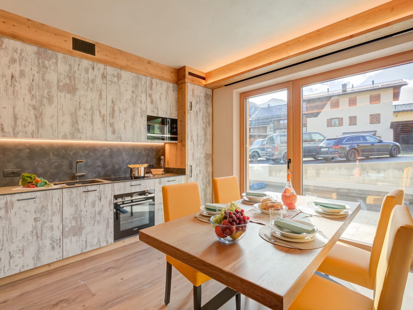 Das geräumige Wohnzimmer mit Sofa und Esstisch ist stilvoll und gemütlich. Die offene Küche ist mit Mikrowelle, Backofen, Toaster, Induktionskochfeld, Wasserkocher und Geschirrspüler ausgestattet.