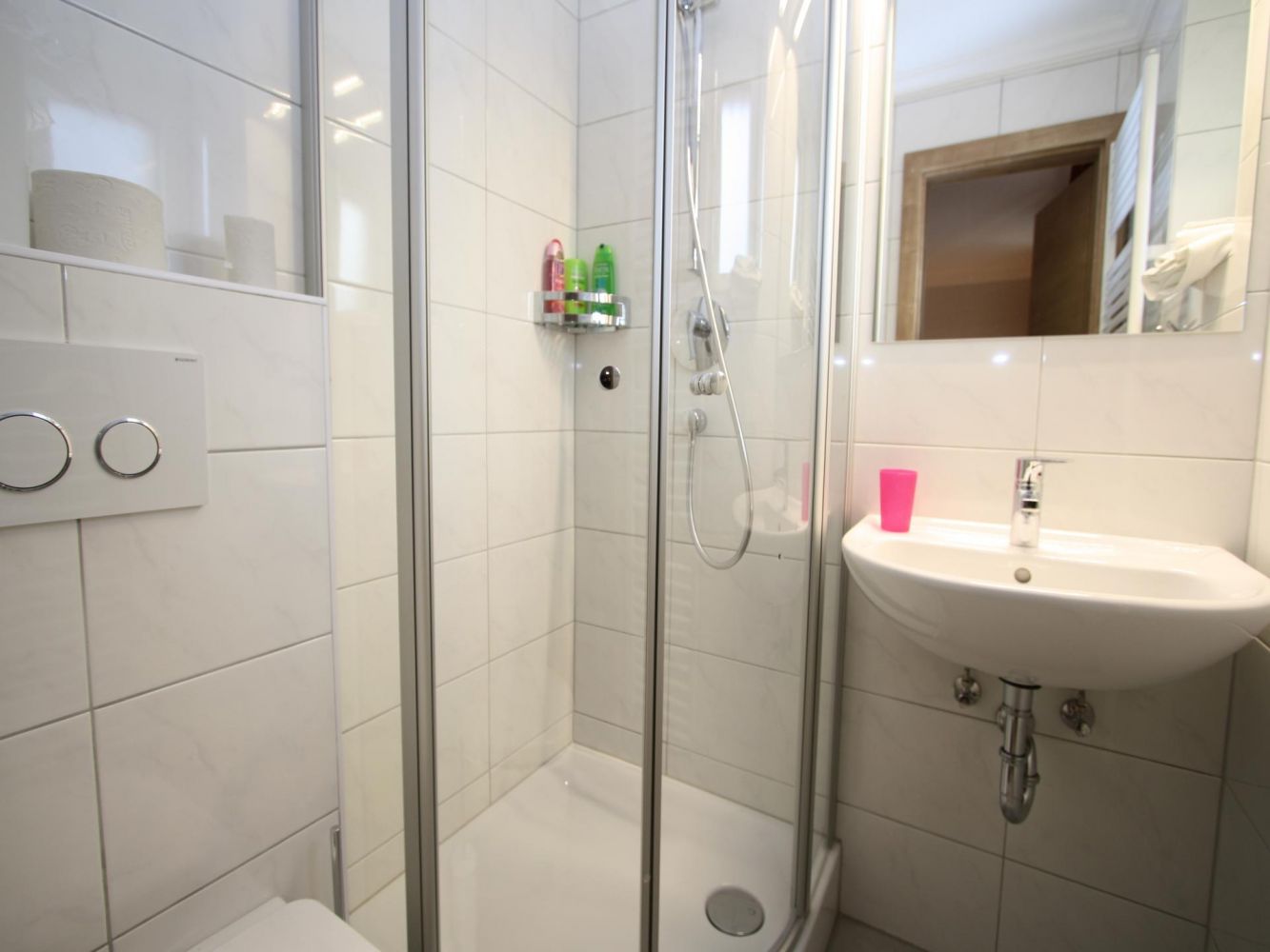 Schlafzimmer mit Doppelbett und Fernseher. Badezimmer mit Dusche und Toilette.