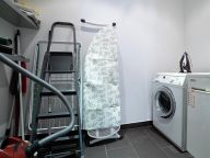 Toilette und Abstellraum mit Waschmaschine, Wäschetrockner, Bügelbrett und Bügeleisen. Terrasse.
