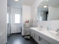 Zwei Schlafzimmer, eines mit einem Doppelbett und eines mit zwei Einzelbetten. Badezimmer mit Badewanne, Dusche, zwei Waschbecken und Waschmaschine. Separate Toilette.