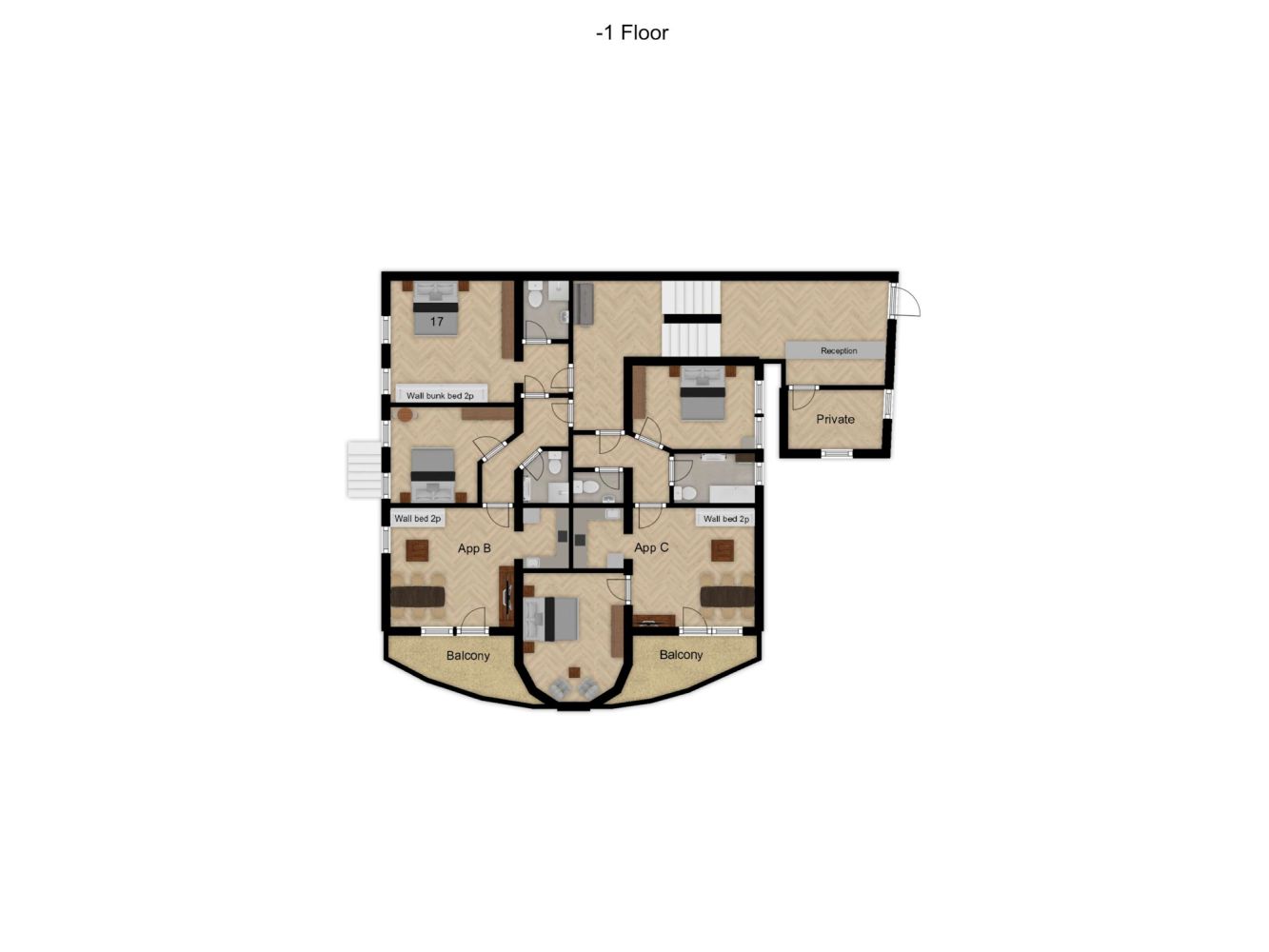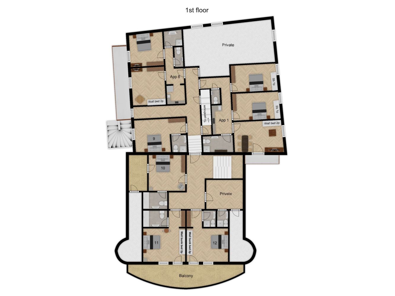Im ersten Stock befinden sich ein Penthouse, zwei Wohnungen und fünf geräumige Schlafzimmer. Das Penthouse mit 11 Betten verfügt über ein Wohnzimmer mit Doppelbett, Doppelschlafcouch und offener Küche mit Essbereich. Vier Schlafzimmer, zwei mit einem Doppelbett und zwei mit zwei Einzelbetten. Zwei Bäder, eines mit Dusche und eines mit Dusche und Badewanne.