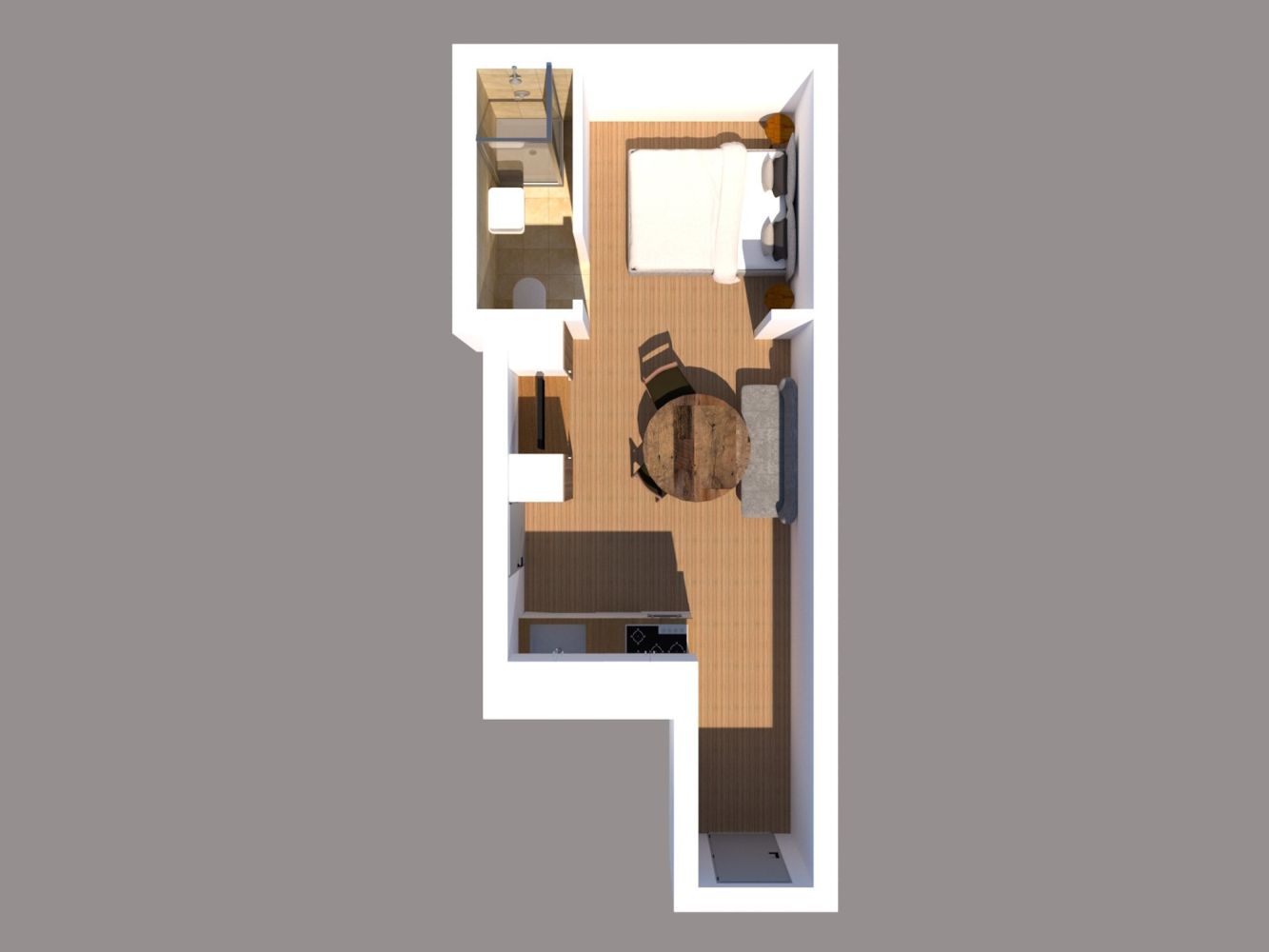 Wohn-/Schlafzimmer mit Doppelbett und Essecke mit Sofa und TV. Kochnische mit Herd, Kühlschrank, Backofen, Mikrowelle, Wasserkocher, Toaster und Nespresso-Kaffeemaschine. Von diesem Raum aus haben Sie Zugang zum Garten.
