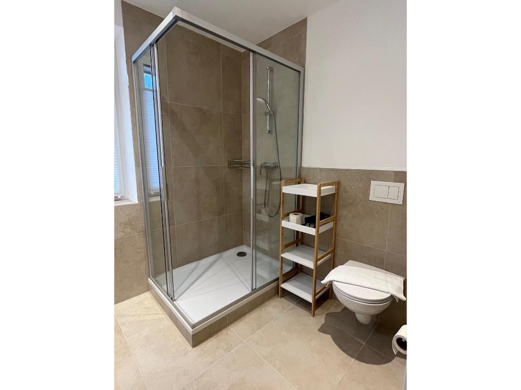 Schlafzimmer mit einem Doppelbett und Fernseher. Badezimmer mit Dusche und Toilette.