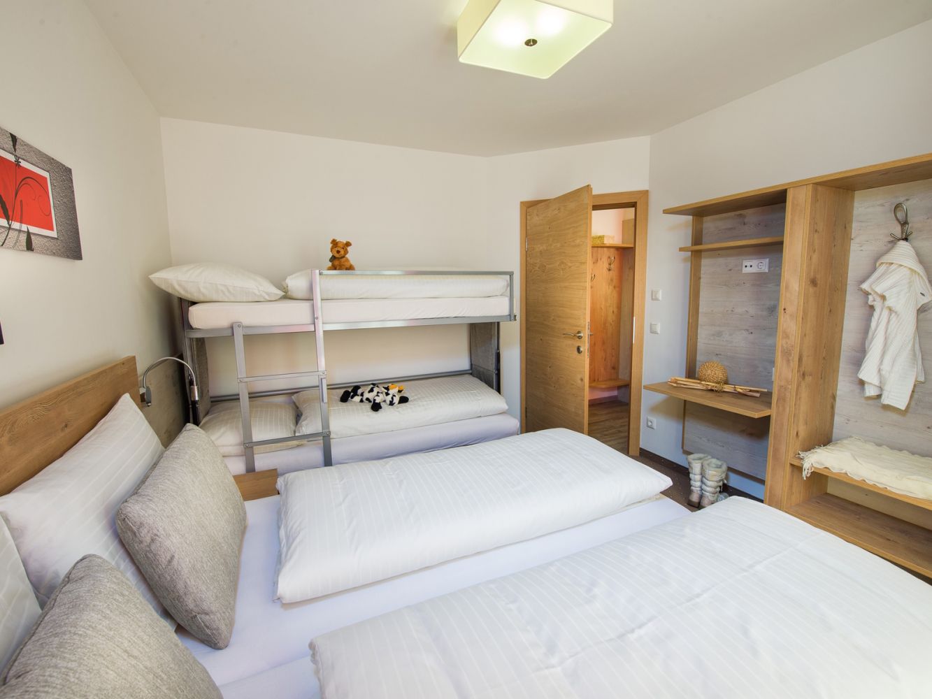 Schlafzimmer mit einem Doppelbett und einem Etagenbett oder einem Schlafsofa. Badezimmer mit Dusche und Toilette.