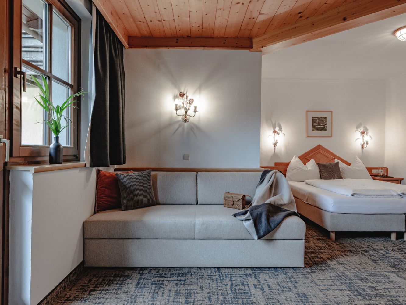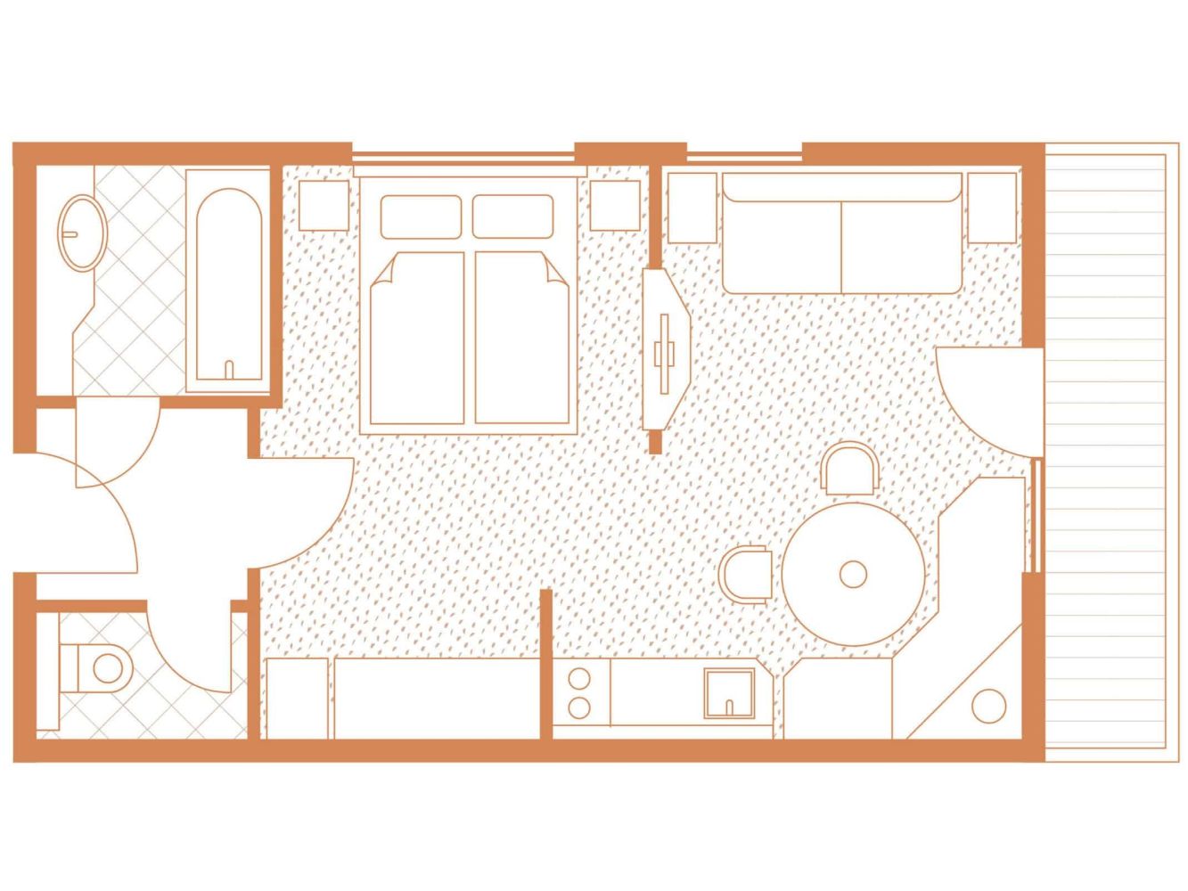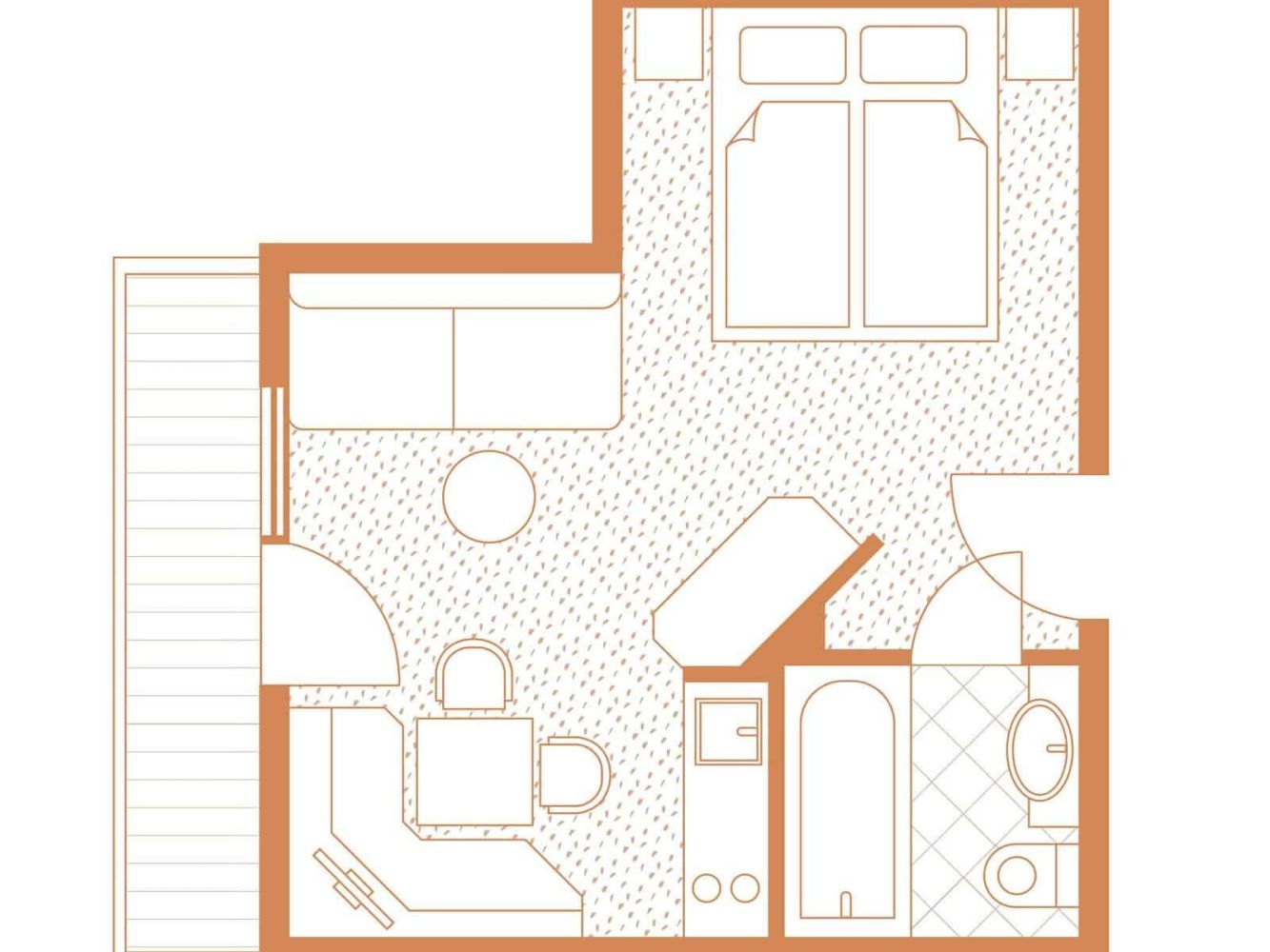 Die Wohnung besteht aus einem Wohn-/Schlafraum mit einem Doppelbett und einem Schlafsofa, einem Bad mit Badewanne/Dusche und WC.
