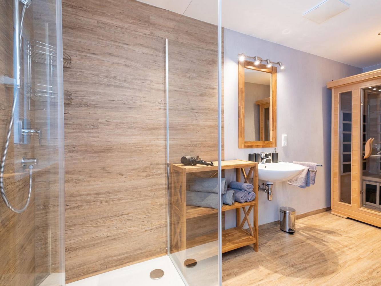 Zwei Schlafzimmer, eines mit einem Doppelbett und einem Schlafsofa, eines mit einem Doppelbett und einem Einzelbett. Badezimmer mit Dusche, Waschbecken und Infrarotkabine. Getrennte Toilette.