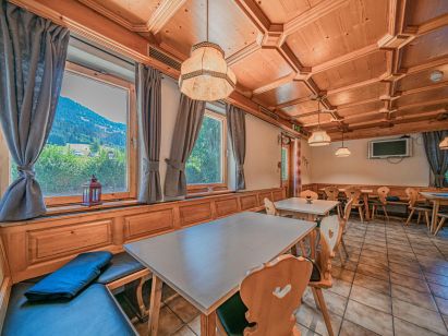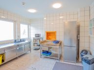 Im Erdgeschoss befindet sich das Wohn-/Esszimmer mit Esstischen, Fernseher und Sitzecke. Küche mit Kochplatten, Mikrowelle, 2 Elektrobacköfen, Geschirrspüler, Kühlschrank, Gefrierschrank, Kaffeemaschine (Filter) und Wasserkocher.