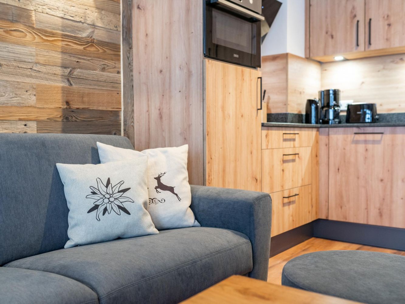 Wohnzimmer mit Sitzecke, Fernseher und Essecke. Voll ausgestattete Küche mit u.a. vier Cerankochfeldern, Kühlschrank mit Gefrierfach, Geschirrspüler, Kombimikrowelle, Kaffeemaschine (Filter), Wasserkocher und Toaster.