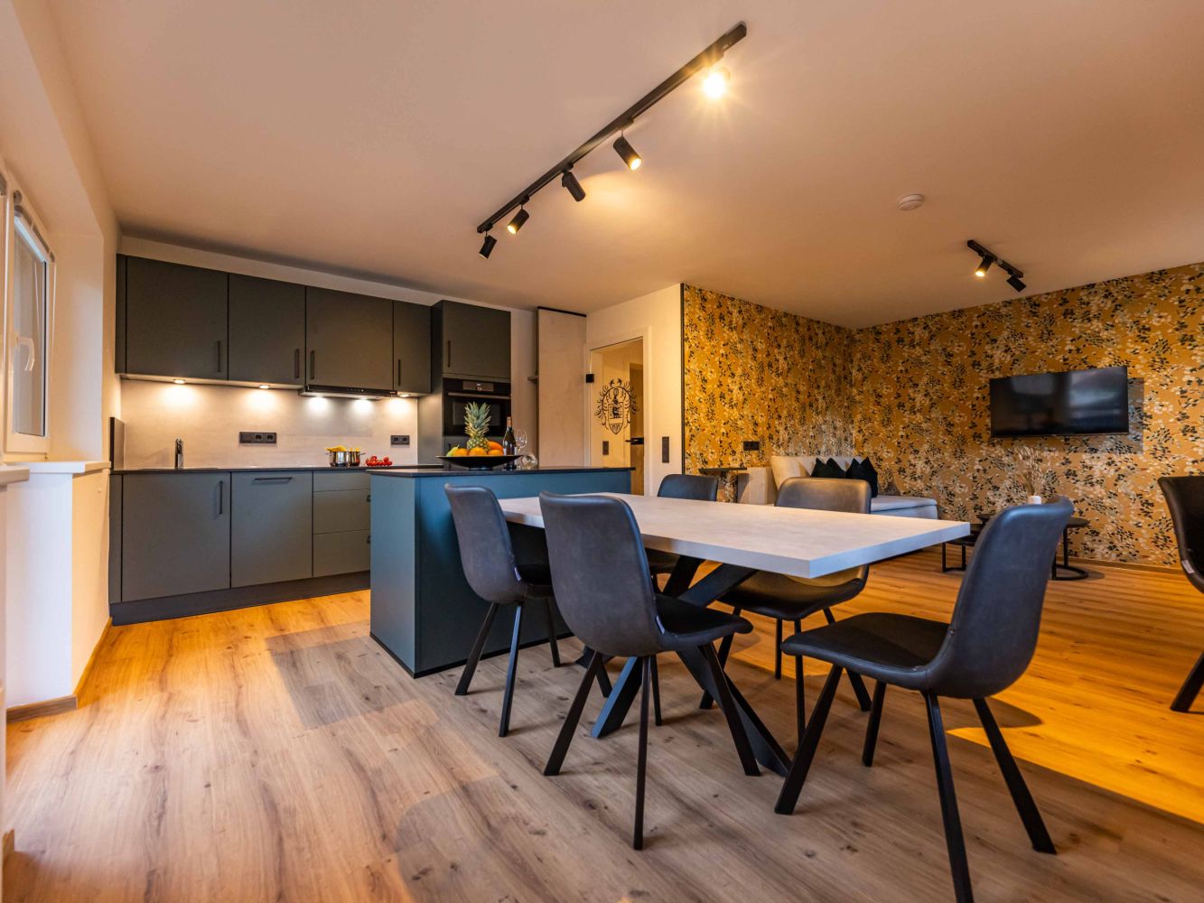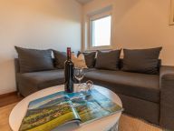 Wohnzimmer mit Sitzecke mit Doppelschlafcouch und Flachbildfernseher. Voll ausgestattete Küche mit u.a. Elektrokochplatten, Backofen, Mikrowelle, Kühlschrank mit Gefrierfach, Geschirrspüler, Kaffeemaschine (Nespresso), Wasserkocher, Toaster und Essecke. Es gibt auch einen Balkon mit Blick auf den Großglockner.