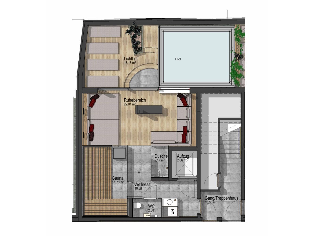 Im Untergeschoss befindet sich der private Wellnessbereich mit Sauna und Whirlpool.
