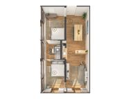 Zwei Schlafzimmer mit je einem Doppelbett. Badezimmer mit Badewanne/Dusche und Toilette.
