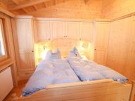 Drei Schlafzimmer, jedes mit einem Doppelbett und eigenem Bad mit Dusche, Waschbecken und Toilette. Ein Schlafzimmer mit Doppelbett, Terrasse und eigenem Bad mit Badewanne, Dusche, Waschbecken und Toilette. Ein Schlafzimmer mit Doppelbett, Etagenbett und eigenem Bad mit Dusche, Doppelwaschbecken und separater Toilette. Ein Schlafzimmer mit einem Doppelbett und eigenem Bad mit Badewanne, Doppelwaschbecken und separater Toilette. Außerdem gibt es zwei separate Toiletten im Chalet.