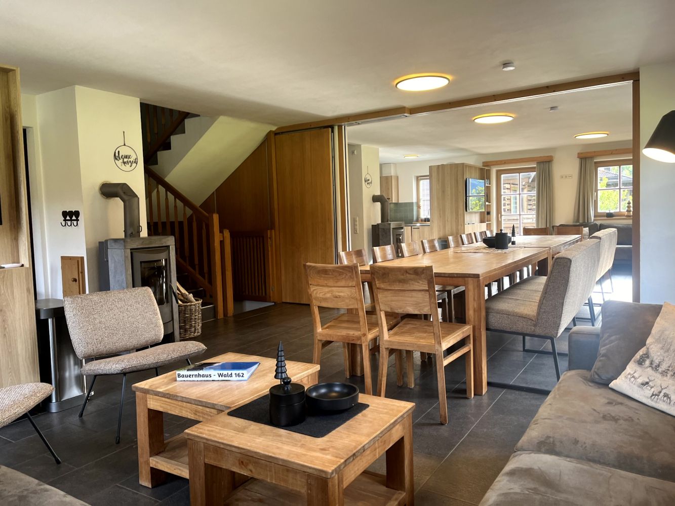 Gemütliches, schönes Wohnzimmer mit zwei gemütlichen Sitzecken mit zwei bequemen Ecksofas, Sessel, Fernseher (Satellit), Holzofen und großem Esstisch. Zwei offene Küchen, beide mit Geschirrspüler, Mikrowelle, Backofen, Herd, Kühl- und Gefrierschrank, Kaffeemaschine und Wasserkocher. Vom Wohnzimmer aus hat man Zugang zu einem großen überdachten Balkon, der sich zur Terrasse neben dem Chalet öffnet (eine Terrasse nach Osten und eine nach Westen).