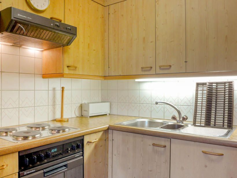 Gemütliches und geräumiges Wohnzimmer mit bequemen Sofas, Kamin, Fernseher, DVD-Player und Essecke. Kleine Küche mit Elektrokochplatten, Kühlschrank, Backofen, Nespresso-Kaffeemaschine, Toaster, Wasserkocher und Spülmaschine. Zwei Sofas im Wohnzimmer können zu einem Schlafsofa umfunktioniert werden, eines davon ist ein Doppelschlafsofa und eines ein Einzelschlafsofa.