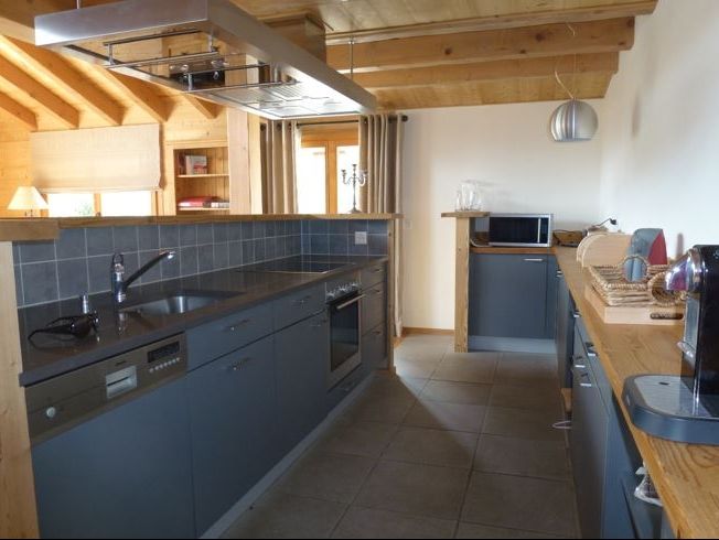 Geräumiges Wohnzimmer mit einer gemütlichen Sitzecke mit Kamin, Fernseher, DVD-Player und Hi-Fi-Anlage, Essbereich und eine offene Küche mit Bar, komplett ausgestattet mit Herd, amerikanischem Kühlschrank mit Gefrierfach, Mikrowelle, Backofen, Geschirrspüler, Kaffeemaschine (Nespresso und Filter), Käsefondue-Set und Gourmet-Set, unter anderem. Es gibt auch ein Spielzimmer mit Fernseher, DVD-Player und Tischtennisplatte. Außerdem verfügt dieses Chalet über eine Waschmaschine und einen Trockner, einen Haartrockner, einen Skiraum, Wi-Fi-Internetanschluss, zwei Balkone und eine Südterrasse.