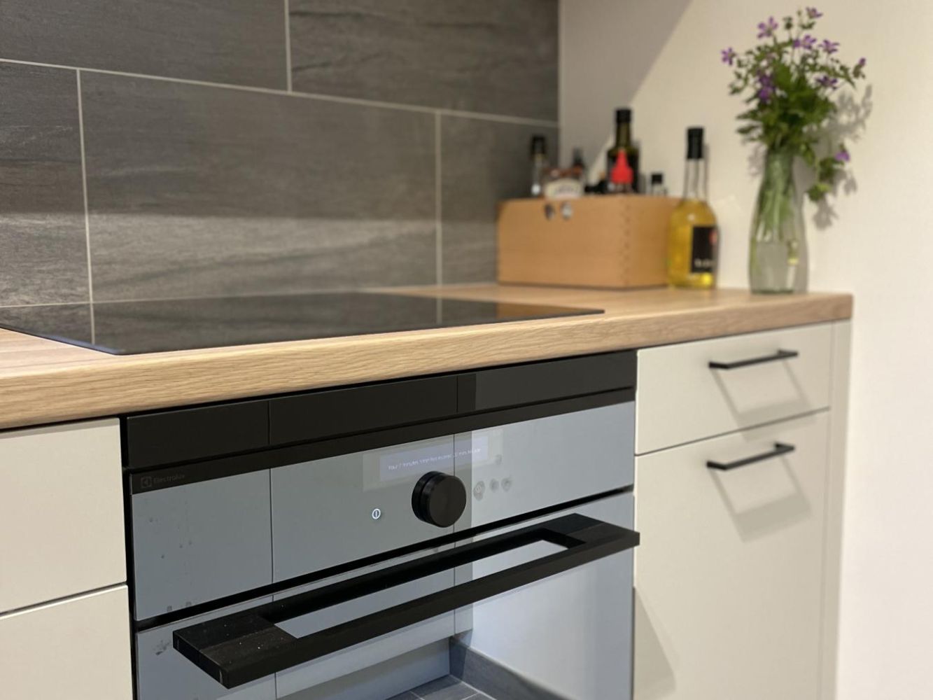 Im Erdgeschoss befindet sich das geräumige Wohnzimmer mit einer gemütlichen Sitzecke, einem Fernseher, einem Esstisch und einer modernen Küche, die unter anderem mit einem Induktionskochfeld, einem Kühlschrank, einem Gefrierschrank, einem Kombi-Backofen, einer Nespresso-Kaffeemaschine, einem Wasserkocher, einem Toaster, einem Fondue-Set, einem Airfryer und einer Spülmaschine ausgestattet ist. Vom Wohnzimmer aus haben Sie Zugang zum Balkon mit herrlichem Panoramablick auf die Berge. Ebenfalls auf dieser Etage befinden sich ein Schlafzimmer mit einem Doppelbett und ein Badezimmer mit Badewanne, Haartrockner und Toilette.