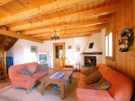 Gemütlich eingerichtetes Wohnzimmer mit Sitzecke, Kamin, Fernseher, Essecke und offener Küche, die u.a. mit Herd, Kühlschrank, Backofen und Geschirrspüler ausgestattet ist. Darüber hinaus verfügt dieses Chalet über eine private Sauna, Waschmaschine, Wi-Fi, Balkon und Terrasse.